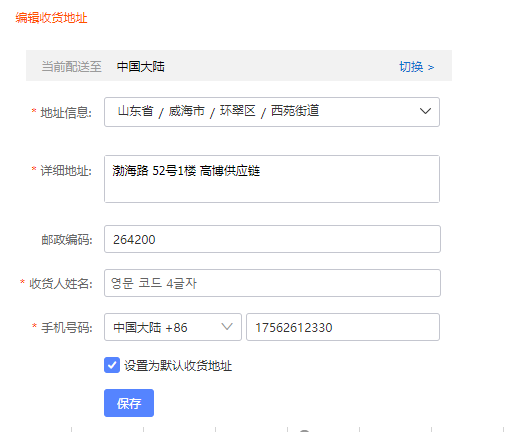 상세주소: 渤海路 52号1楼 高博供应链 (영문코드 4자리)